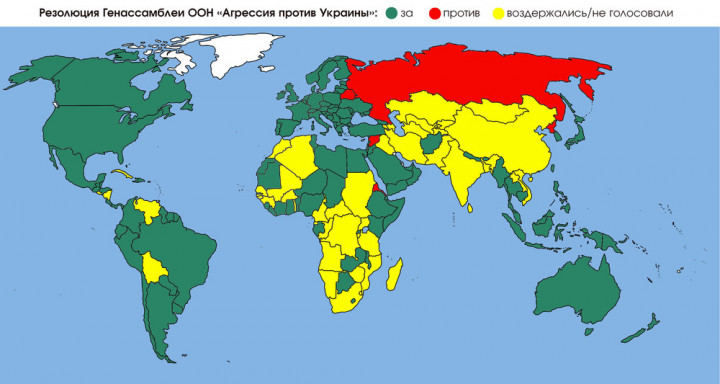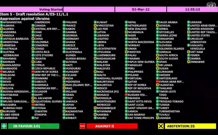 На заседании Генеральной ассамблеи ООН 2 марта 141 страна поддержала резолюцию «Агрессия против Украины», 35 государств воздержались и пять выступили против.