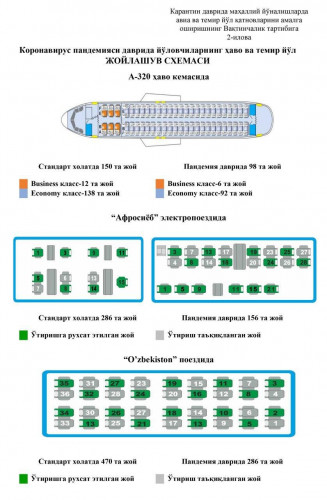 Временная схема рассадки пассажиров в самолетах и поездах Afrosiyob и "Узбекистон" с учетом сохранения социальной дистанции.