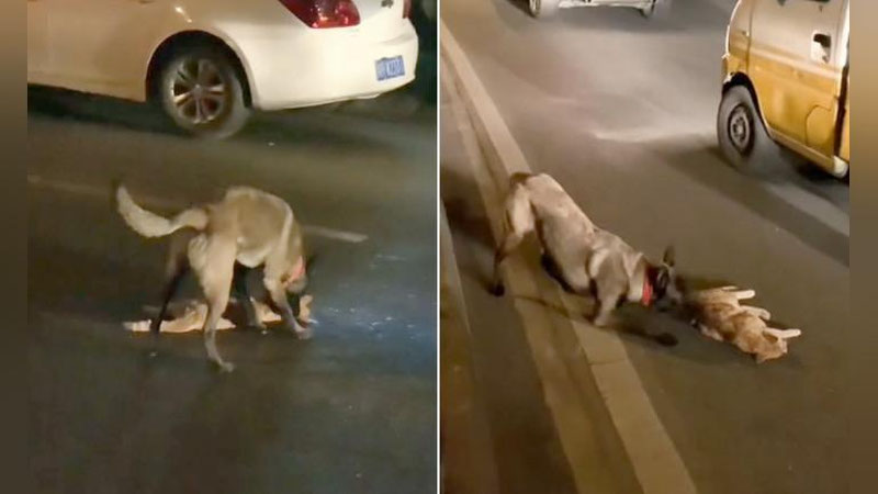 Xitoyda Qora pantera laqabli it yo`l o`rtasida o`lik holda yotgan mushukni sudrab, yo`l chetiga olib o`tdi (video)