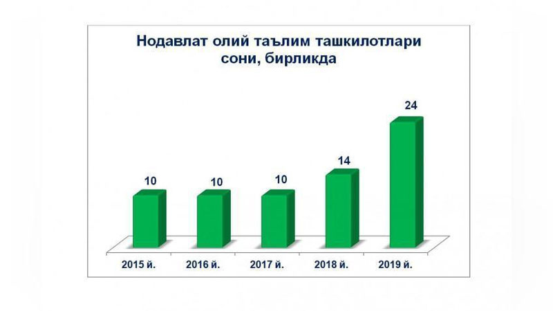 Davlat statistika qo`mitasi ma`lumotlariga ko`ra, respublikamizda 2019/2020 o`quv yili boshida jami oliy ta`lim tashkilotlari soni 119 tani tashkil etgan. Mazkur oliy ta`lim tashkilotlarida jami 441,0 ming nafar talaba tahsil olmoqda.