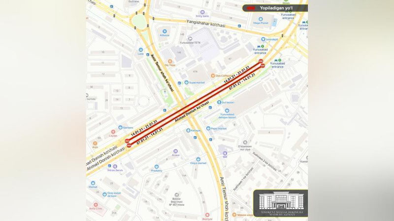 Toshkent shahar hokimligining ma`lum qilishicha, yo`l ta`mirlash ishlari olib borilishi sababli Ahmad Donish ko`chasining bir qismi avtotransport vositalarining qatnovi uchun yopiladi: