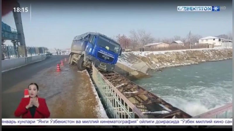 Mashina ko`prik ustida harakatlanib ketayotgan vaqtda muzlama sabab chetga surilib ketgan. Natijada yuk mashinasi himoya panjaralariga urilib xavfli vaziyat yuzaga kelgan.