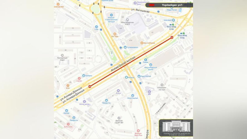 Toshkent shahar hokimligi Matbuot xizmatining ma`lum qilishicha, yo`l-ta`mirlash ishlarini jadallashtirish, ishlarni tezroq yakunlash maqsadida Ahmad Donish ko`chasining Amir Temur shoh ko`chasi ustidan o`tgan ko`prikning bir tarafi, ya`ni 7-son (oldingi 17-son) Shahar klinik shifoxonasidan Yunusobod metrosi yo`nalishidagi (mo`ljal: Universam) qismi avtotransport vositalarining qatnovi uchun to`liq yopiladi.