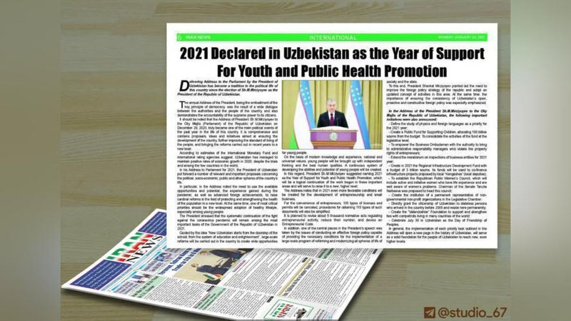 Eronning ingliz tilida chop etiladigan etakchi gazetasi bo`lgan «Iran News» nashri sahifasida O`zbekiston Prezidenti Shavkat Mirziyoevning 2020 yil 29 dekabrda Oliy Majlisga murojaatnomasida ilgari surilgan muhim tashabbuslariga bag`ishlangan maqola chop etildi.