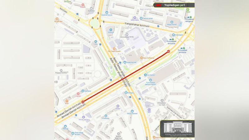 Yo`l-ta`mirlash ishlarini tezroq yakunlash maqsadida Amir Temur shox ko`chasi ustidan o`tgan ko`prikning (mo`ljal “Universam”) bir tomoni “Yunusobod” metro bekatidan 7-son Shahar klinik shifoxonasi yo`nalishida transport harakati uchun vaqtincha yopiladi. Bu haqda Toshkent shahar hokimligi Axborot xizmati xabar bermoqda.