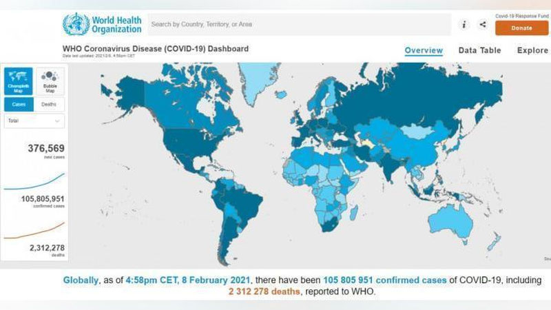 Jahon sog`liqni saqlash tashkiloti ma`lumotlariga ko`ra, dunyoda koronavirus infeksiyasini yuqtirganlar soni 105 million 805 mingdan ortiqni tashkil etmoqda, shundan 2 million 312 mingdan ziyod kishi vafot etgan (8.02.2021 yil Evropa vaqti bilan soat 16:58 holatiga ko`ra). Bu haqda Sog`liqni saqlash vazirligining Jamoatchilik bilan aloqalar bo`limi xabar berdi.