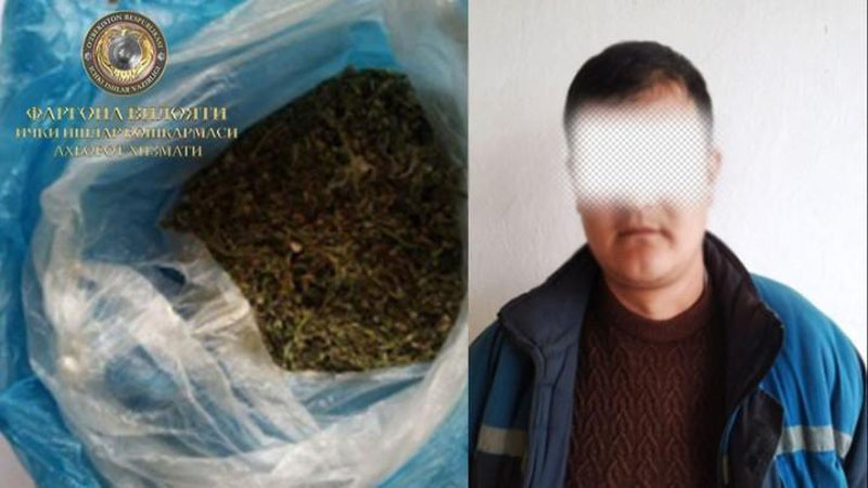 11 mart kuni tuman IIB TEQKB xamda JQB xodimlari tomonidan o`tkazilgan tezkor tadbir davomida, "Gulobod" mahallasi hududida yashovchi Yu.Sh.ni yashash xonadoni xolislar ishtirokida ko`zdan kechirilganda, xonadoni yotoqxonasidagi ko`rpachalar orasida ko`k rangli sellofan paketga o`ralgan “marixuana” giyohvandlik moddasini saqlab kelayotganligi aniqlanib, daliliy ashyo tariqasida olingan. Bu haqda Farg`ona viloyati IIB Axborot xizmati ma`lum qildi.