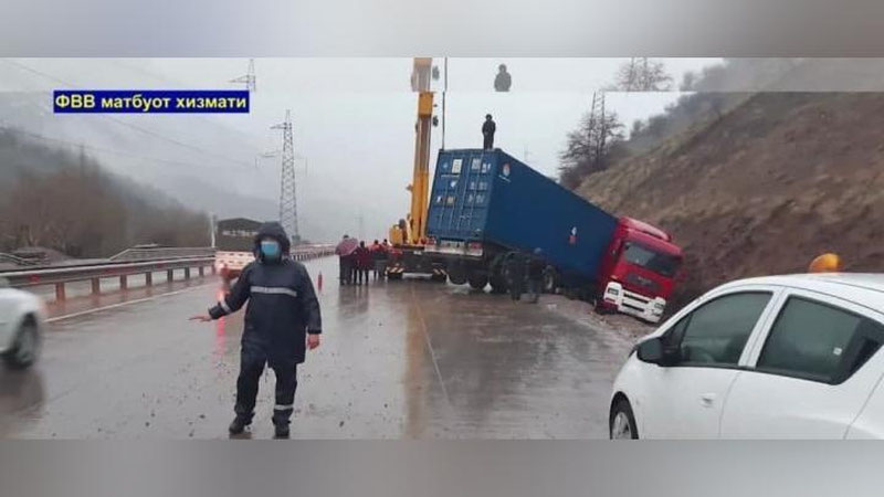 '“Qamchiq” dovonida yuk mashinasi yo`l chetidagi xandaqqa tushib ketdi (video)'ning rasmi