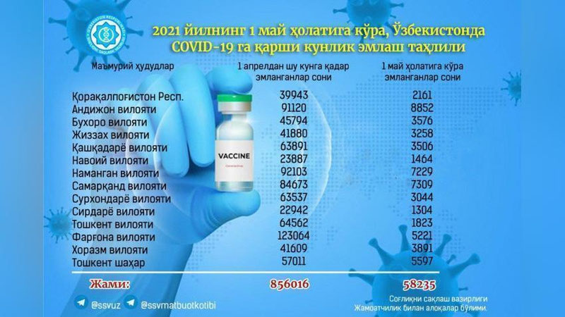 1 may kuni mamlakatimiz hududlari bo`ylab jami 58235 nafar kishi COVID-19 ga qarshi emlandi. Bu haqda SSV xabar bermoqda.