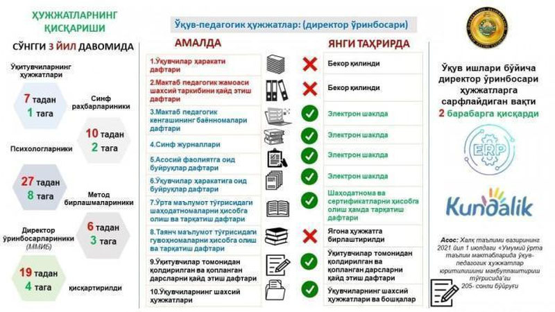 Xalq ta`limi vazirining 2021 yil 1 iyuldagi buyrug`i bilan shu kunga qadar maktablarda yuritilgan 10 dan ortiq o`quv-pedagogik hujjatlar soni 2 baravarga qisqartirildi va elektron shaklda yuritilishi belgilandi. Bu haqda vazirlik matbuot xizmati xabar bermoqda.