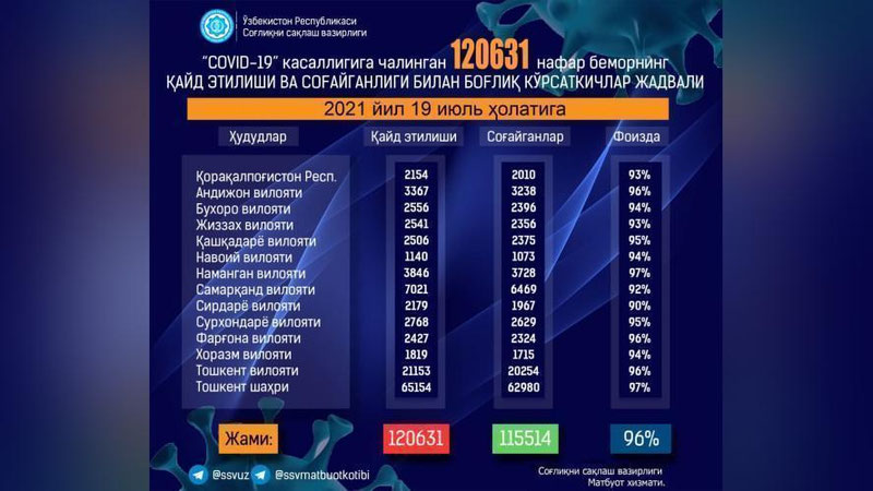 2021 yil 19 iyul holatiga ko`ra, O`zbekistonda koronavirus infeksiyasi qayd etilganlar soni 120631 (+658) nafarni tashkil etmoqda.