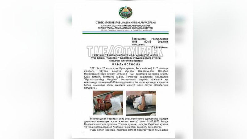 Ijtimoiy tarmoqlarda shu yilning 19 iyul kuni 15-16 yoshli bolalar 45 yoshli taksichini vaxshiylarcha o`ldirib dalaga tashlab ketishganligi haqida xabarlar tarqalgan. Mazkur holat yuzasidan 20 iyul kuni Farg`ona viloyati prokuraturasi tomonidan Jinoyat kodeksining 97 (Qasddan odam o`ldirish) va 164 (Bosqinchilik) bilan jinoyat ishi qo`zg`atilgan. Bu haqda Bosh prokurorining matbuot kotibi - axborot siyosati masalalari bo`yicha maslahatchisi xabar bermoqda.
