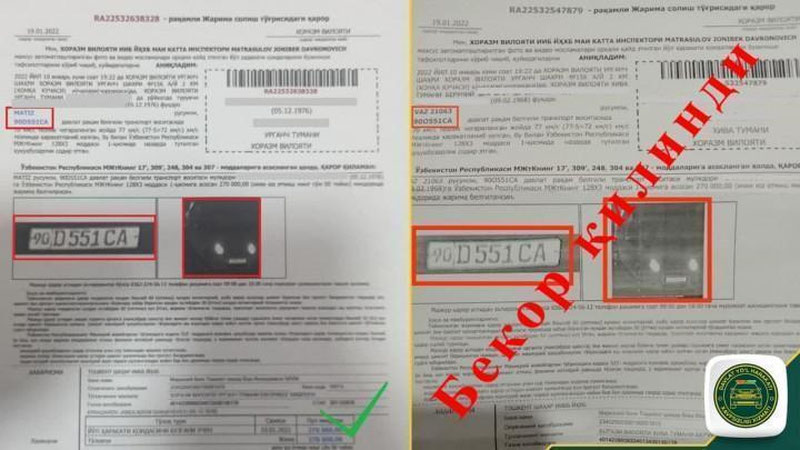 Ma`lum qilinishicha, Xorazm viloyati IIB JXX YHXB mas`ul xodimi tomonidan xatolikka yo`l qo`yilgan. Ya`ni, 2022 yilning 10 yanvar kuni soat 19:22da Xorazm viloyati, Urganch shahar hududidan o`tuvchi 4P-156 avtomobil yo`lining 2-kilometrida "Matiz" rusumli, 90D551CA davlat raqam belgili avtomobil haydovchisi 70 km/soat tezlik chegaralangan joyda 77 km/soat tezlikda harakatlanganligi maxsus moslama yordamida qayd etilgan bo`lib, qayd etish vaqtida avtomatik tarzda 90D551CA davlat raqam belgisidagi "D" harfi "O" bo`lib, 90O551CA tarzida noto`g`ri qayd etilgan, mas`ul nazoratchi xodimning e`tiborsizligi sabab, ushbu jarima "Vaz-21063" rusumli, 90O551CA davlat raqam belgili avtomobil mulkdorining yashash manziliga yuborilganligi ma`lum bo`ldi.