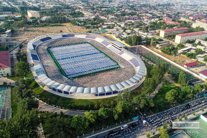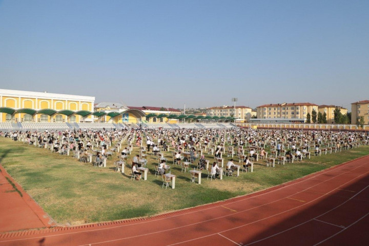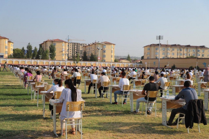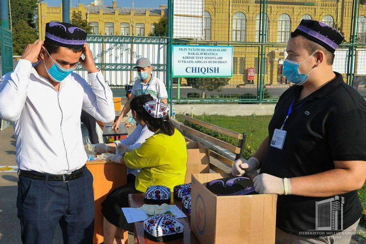 В Фергане на 6 стадионах проходят испытания для поступления в высшие учебные заведения. Абитуриентам на входе раздавали национальные головные уборы - дуппи, чтобы солнце не напекло голову.