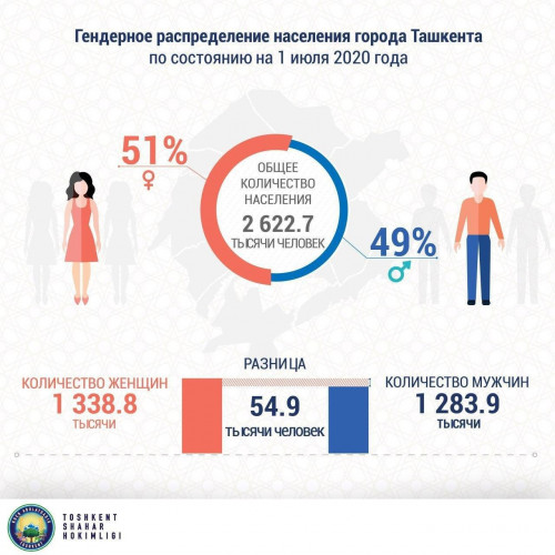 Численность постоянного населения города Ташкента на 1 июля составляет 2 млн 622 тысячи человек.