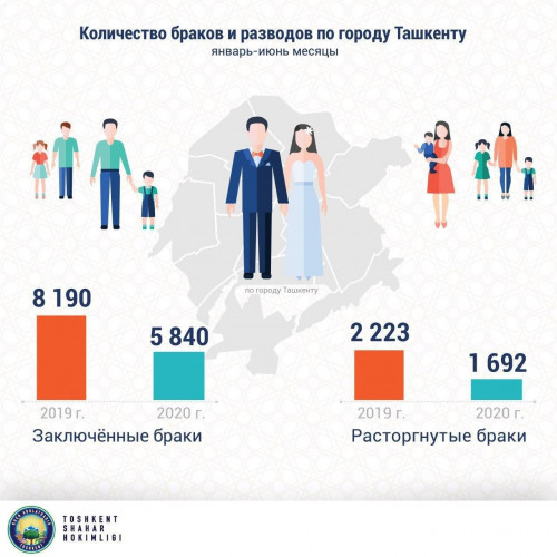 Из них женщин больше чем мужчин на 2%. Об этом со ссылкой на городское управление статистики сообщила пресс-служба хокимията. С января по июнь включительно по сравнению с аналогичным периодом прошлого года в столице снизилось как количество браков, так и разводов. Всего за полгода в Ташкенте было заключено 5 840 браков и зарегистрировано 1 692 развода. Почти вдвое увеличились показатели миграции населения в Ташкент.