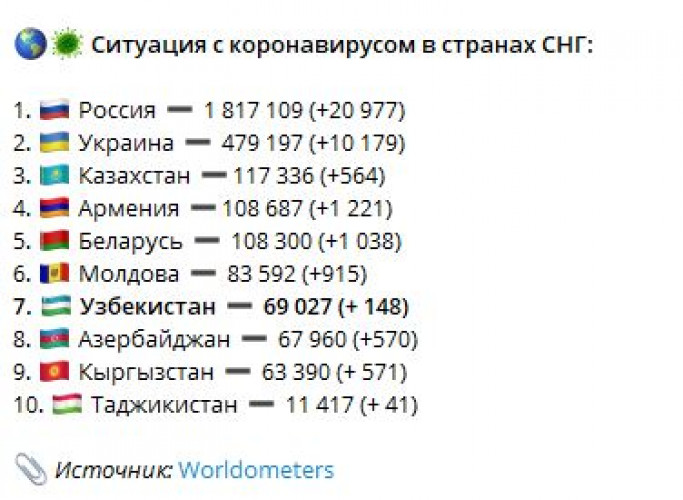 Согласно последним озвученным данным, по состоянию на 18:00 10 ноября количество официально зарегистрированных случаев коронавирусной инфекции в Узбекистане составляет 69095 (+150).