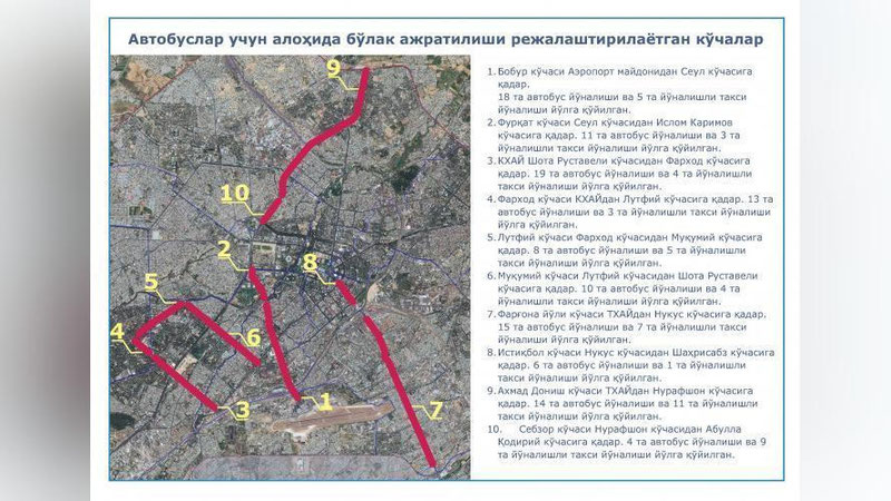 На 10 улицах Ташкента планируется создание отдельных полос для движения автобусов, линейных такси, машин скорой помощи и пожарных машин.