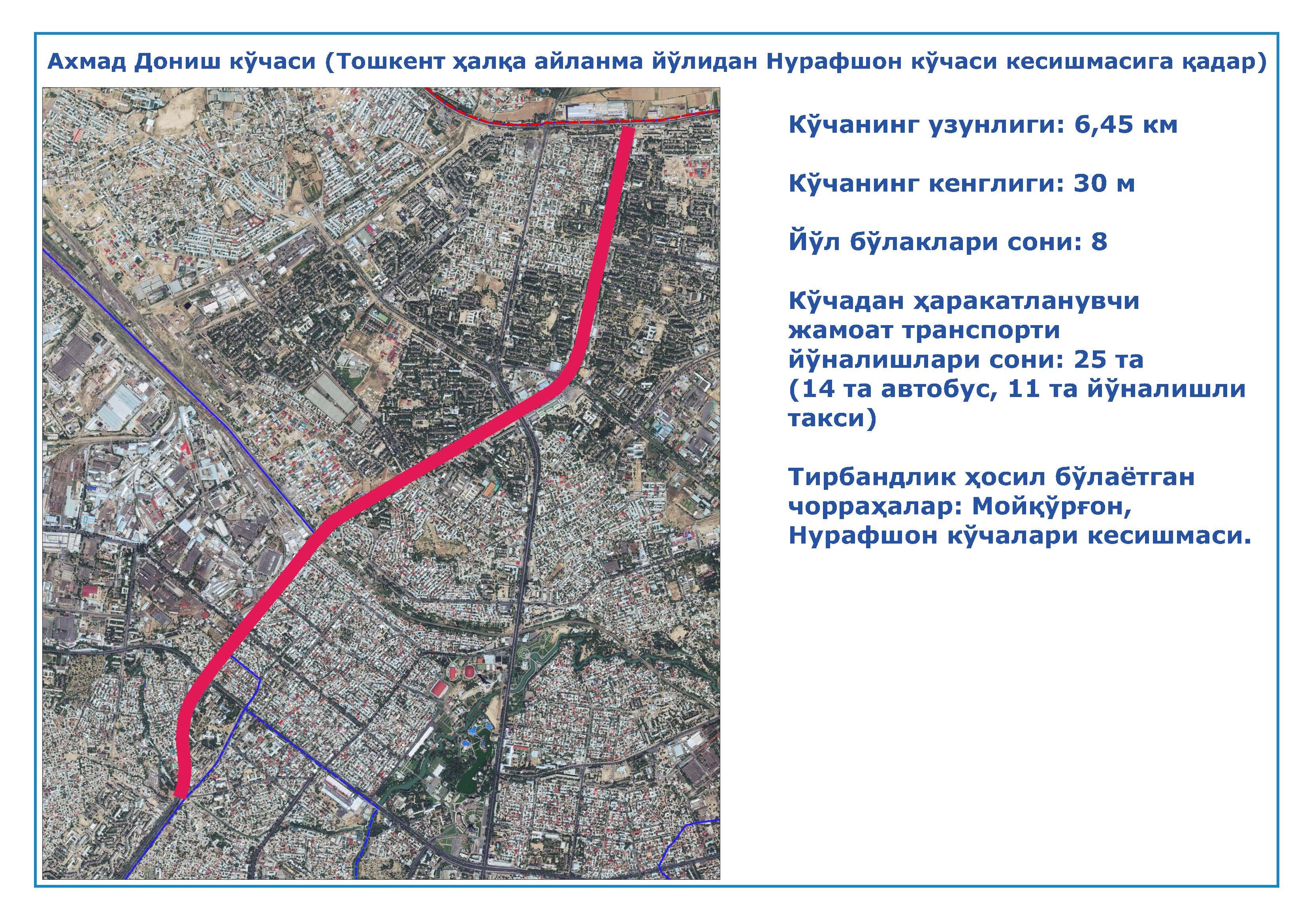 9. Улица Ахмад Дониш (Ташкентская кольцевая дорога – пересечение улицы Нурафшон);