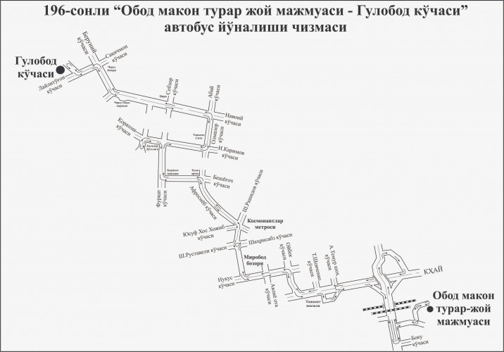 C 09.03.2021 года в Ташкенте открыт новый автобусный маршрут №196 (Улица Гулабад (Чорсу) - Ж/к Обод Макон), сообщает информационный портал, посвященный общественному транспорту Ташкента Tashtrans.uz.