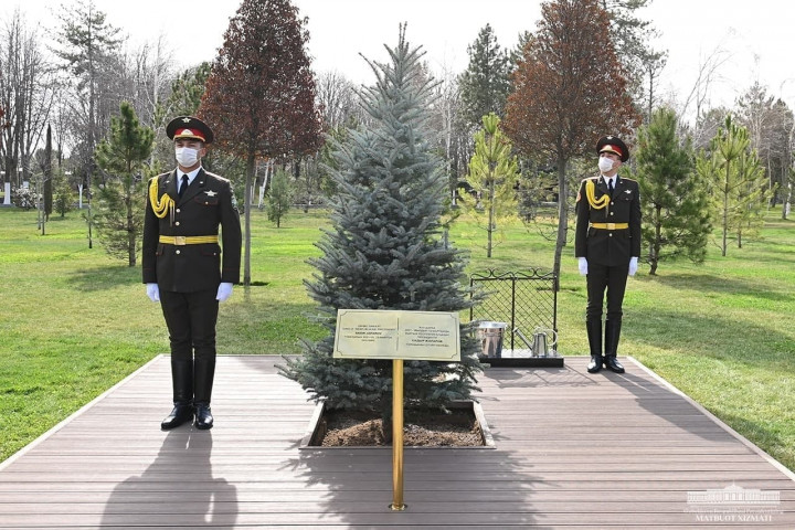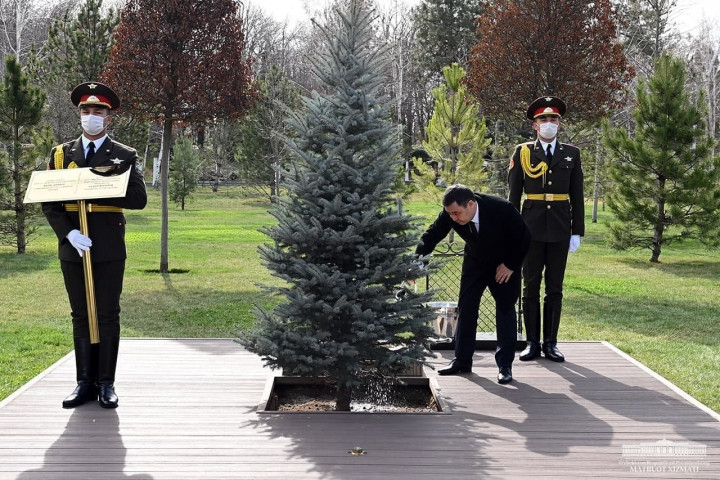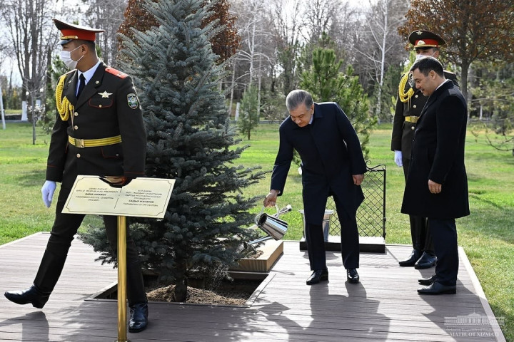 Президент Шавкат Мирзиёев и Президент Садыр Жапаров 12 марта высадили дерево на Аллее почетных гостей в резиденции Куксарой.