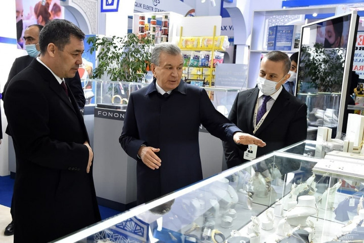 Главы государств ознакомились с выставкой промышленных, сельскохозяйственных и ремесленнических товаров Узбекистана. На выставке представлено более тысячи видов продукции, выпускаемой 24 отраслями и 14 регионами нашей страны.