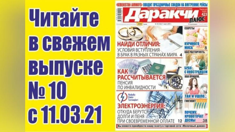 Приобрести новый номер газеты можно в киосках "Матбуот таркатувчи" и торговой сети "Молочный домик".