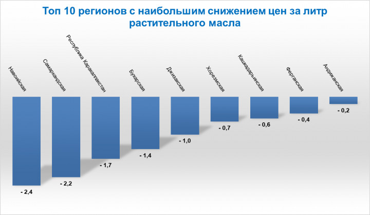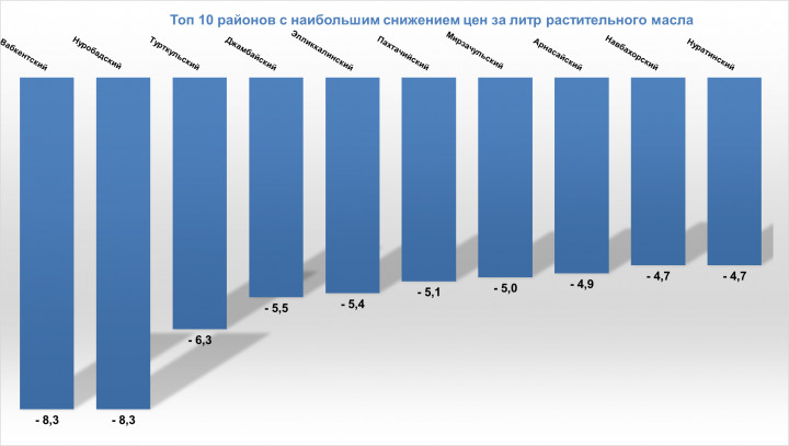 В разрезе районов наибольшее снижение цены за литр растительного масла отмечается в Вабкентском (на 8,3%), Турткульском (на 6,3%), Джамбайском (на 5,5%), Эликалинском (на 5,4%), Пахтачийском (на 5,1%), Мирзачульском (на 5%) районах.