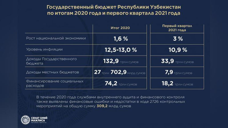 Объем ВВП превысил 580 трлн сумов. Об этом говорилось в ходе обсуждения в Сенате отчета Кабинета Министров об исполнении Государственного бюджета по итогам 2020 года и первого квартала 2021 года. Как отмечалось, объем ВВП в 1 квартале этого года по сравнению с аналогичным периодом прошлого года вырос на 3 процента.