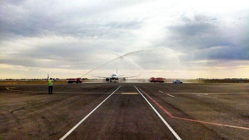 По авиационной традиции самолет, выполнивший рейс по маршруту Стамбул – Ургенч, встретили «водным салютом» под звуки карнаев-сурнаев.
