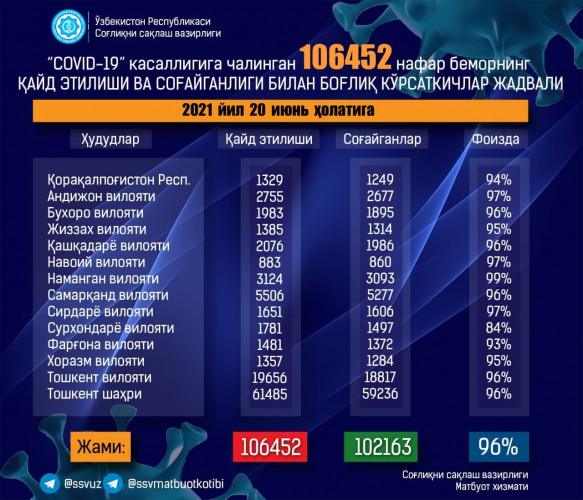 По итогам 20 июня 2021 года количество официально зарегистрированных случаев коронавирусной инфекции в Узбекистане составляет 106452, сообщает пресс-служба Минздрава.