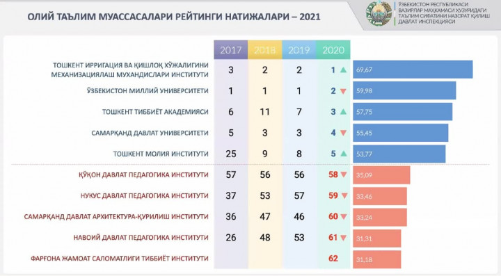 Последние места занимают Самаркандский архитектурно-строительный институт, Навоийский государственный педагогический институт и Ферганский медицинский институт общественного здоровья.