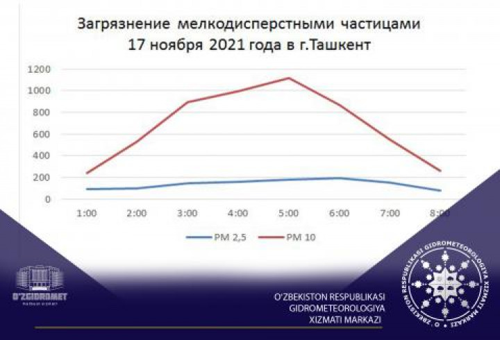 В 5:10 зафиксировано резкое повышение взвешенных частиц в атмосферном воздухе г.Ташкента, которое составило 2.3ПДК. При выпадении осадков стало происходить очищение воздуха.