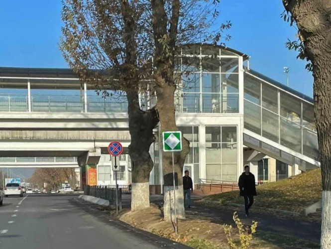 В соцсетях распространилось фото с загадочным дорожным знаком, установленным перед надземным пешеходным переходом на выходе из метро "Мирзо Улугбек".