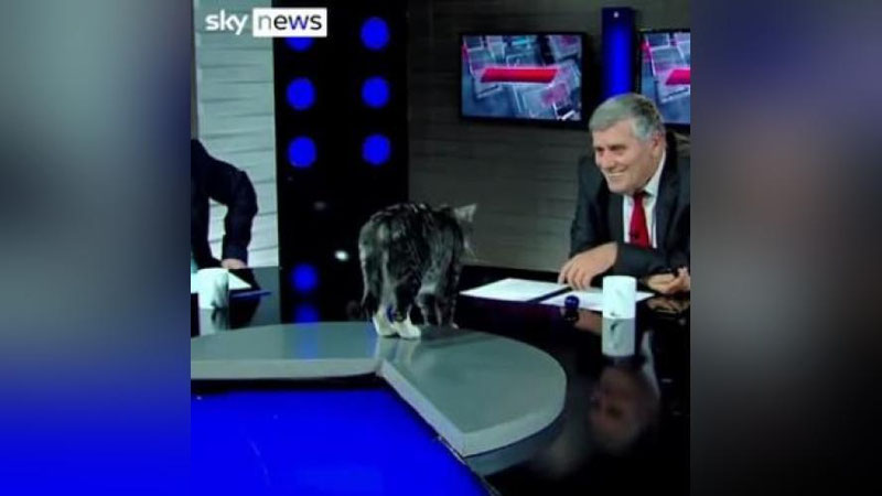 Участники телевизионного шоу вели диалог о политике, когда на стол студии запрыгнула кошка.
