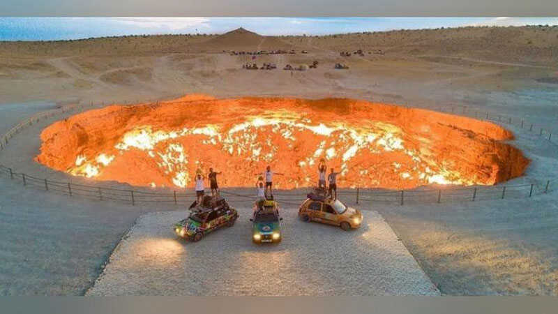 "Врата ада" - это впадина, расположенная в пустыне Каракумы, в 266 километрах севернее Ашхабада, около села Дарваза. Диаметр - около 60 метров, глубина - 20 метров. В 1971 году, когда на этом месте бурили скважину, произошел обвал грунта. Геологи решили поджечь выходящий из провала газ, предполагая, что пожар прекратится через несколько дней. Однако природный газ, выходящий из кратера, все эти годы непрерывно горит днем и ночью.