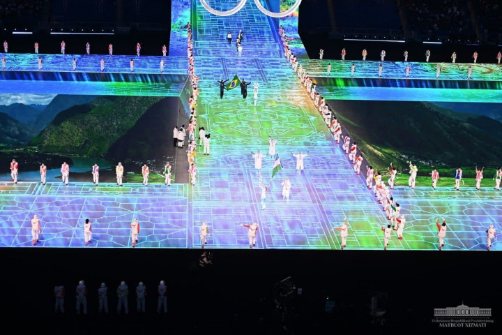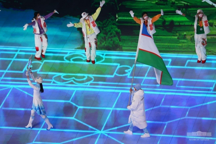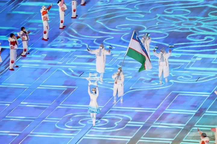 Затем состоялся Парад наций. По стадиону маршем прошли спортивные делегации стран-участниц зимней Олимпиады, в том числе Узбекистана, который представляет горнолыжник Комилжон Тухтаев. Он торжественно пронес Государственный флаг Узбекистана.