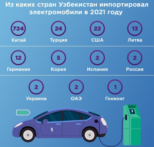 Отметим, в прошлом году в Узбекистан импортировано 809 электромобилей из 11 стран на сумму 16,9 млн долларов США. За год импорт электромобилей увеличился на 679 единиц – в 6,2 раза.