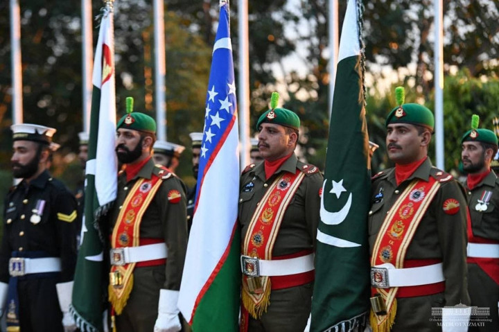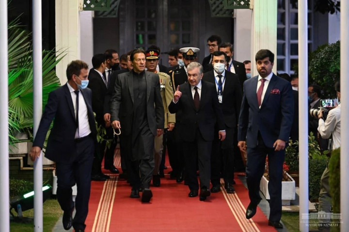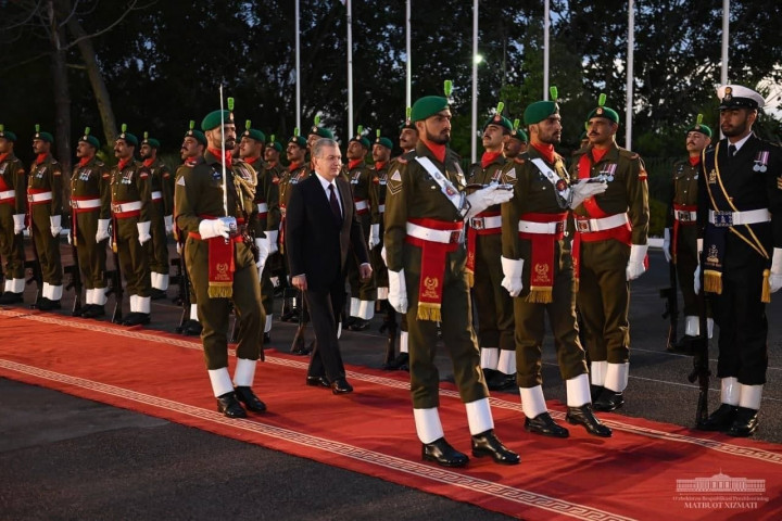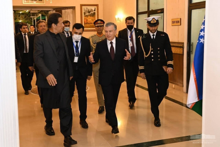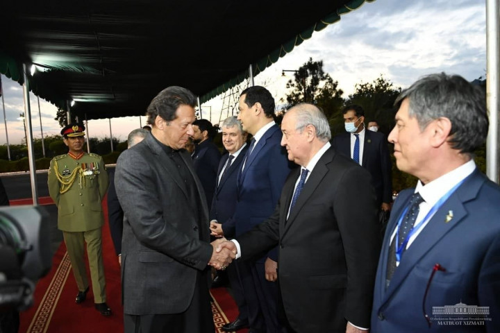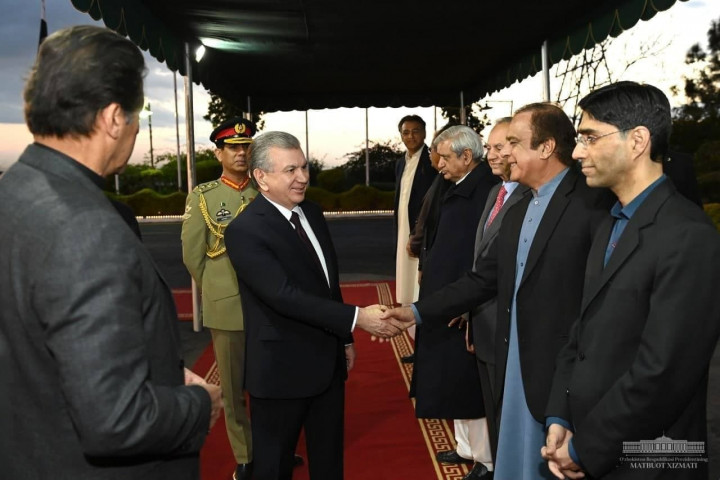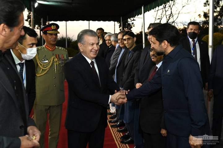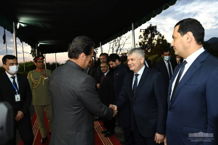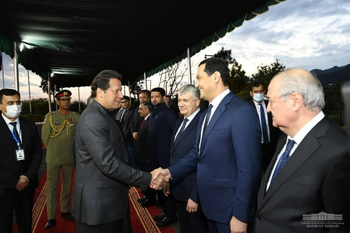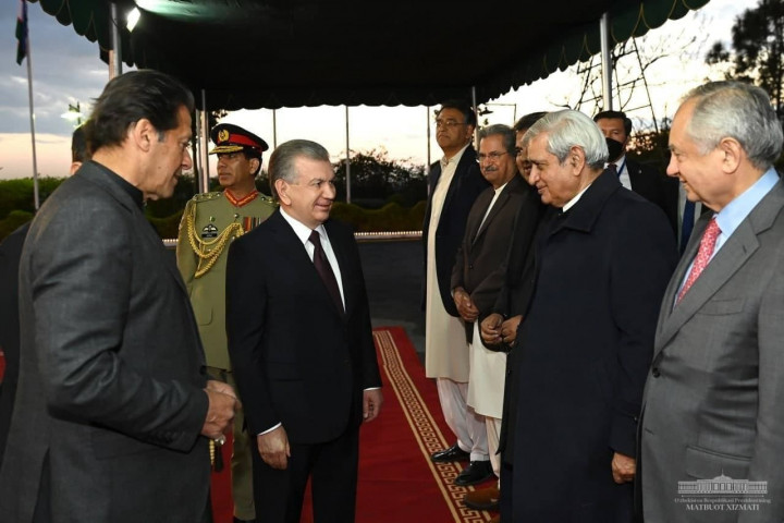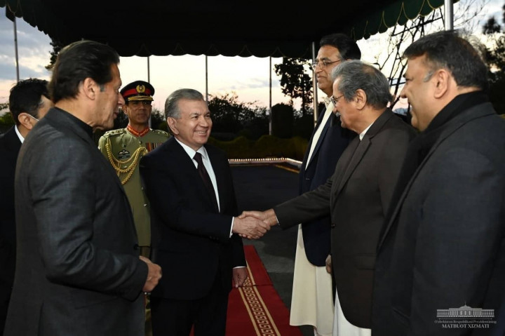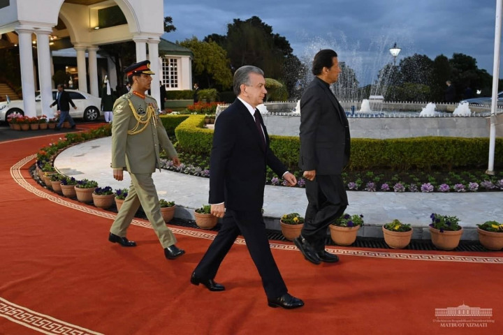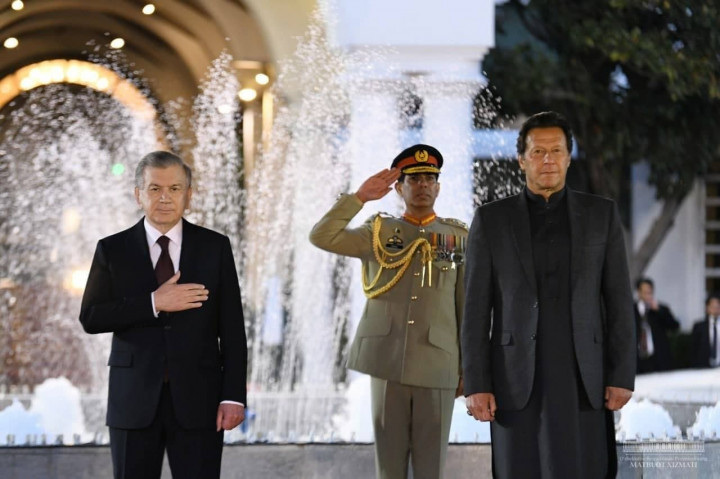 Шавкат Мирзиёев и Имран Хан обошли строй почетного караула и поднялись на трибуну. Прозвучали государственные гимны Узбекистана и Пакистана.