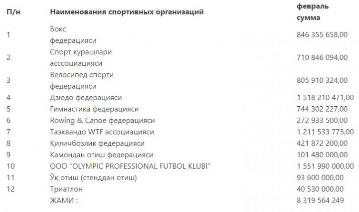 В феврале 2022 года из средств, выделенных по заявкам 12 спортивных Федераций и Ассоциаций, готовящихся к Олимпийским играм Париж-2024, было профинансировано проведение местных и международных учебно-тренировочных сборов в размере 8 млрд 319 млн 564 тысячи 249 сумов.