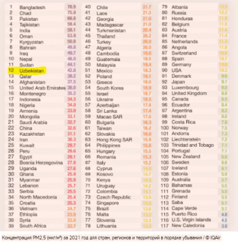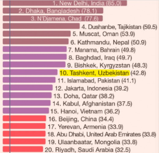 Узбекистан в рейтинге находится на 12-м месте, а Ташкент и вовсе вошел в первую десятку городов мира с самым загрязненным воздухом.