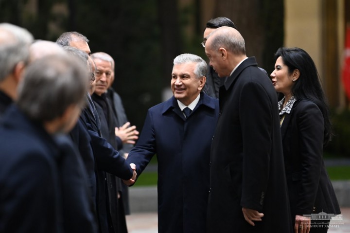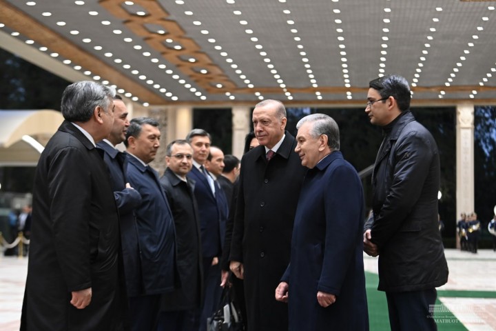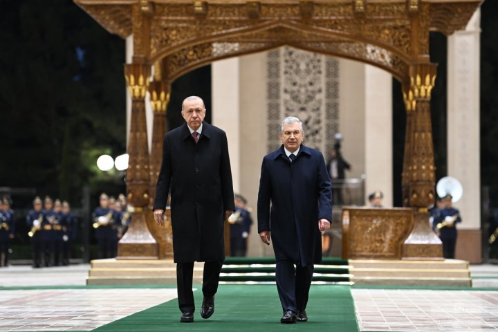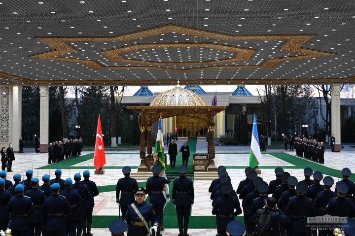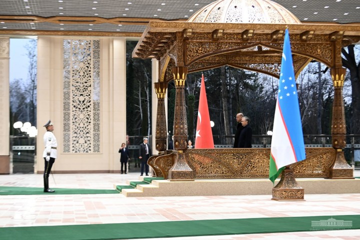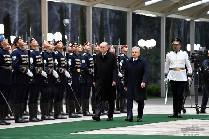 Шавкат Мирзиёев и Реджеп Тайип Эрдоган поднялись на трибуну. Прозвучали государственные гимны Узбекистана и Турции. Военнослужащие Почётного караула прошли перед главами государств торжественным маршем.