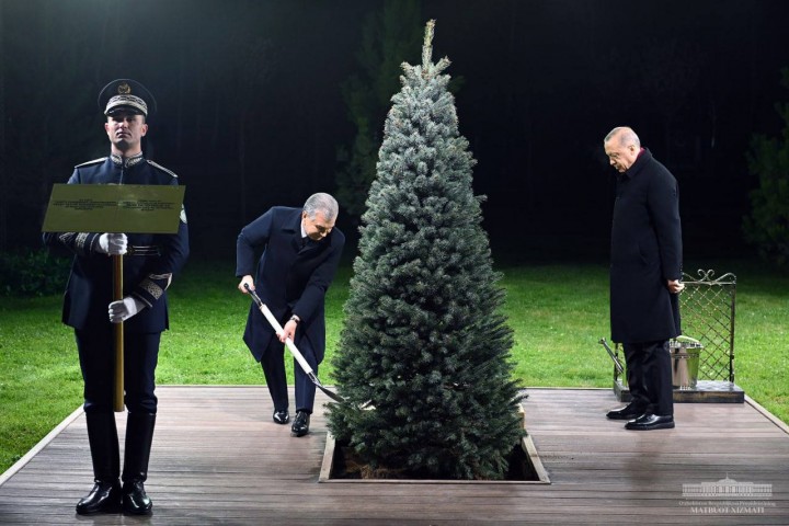 Президент Узбекистана Шавкат Мирзиёев и Президент Турции Реджеп Тайип Эрдоган вместе посадили дерево на Аллее почетных гостей в резиденции Куксарой.