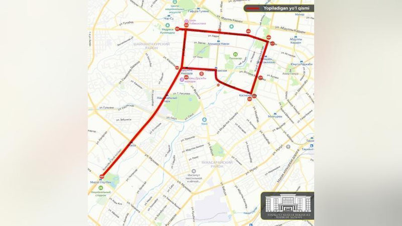 • от пересечения проспекта Алишера Навои с улицей Шарофа Рашидова — вдоль этой улицы до улицы Афросиёб.
