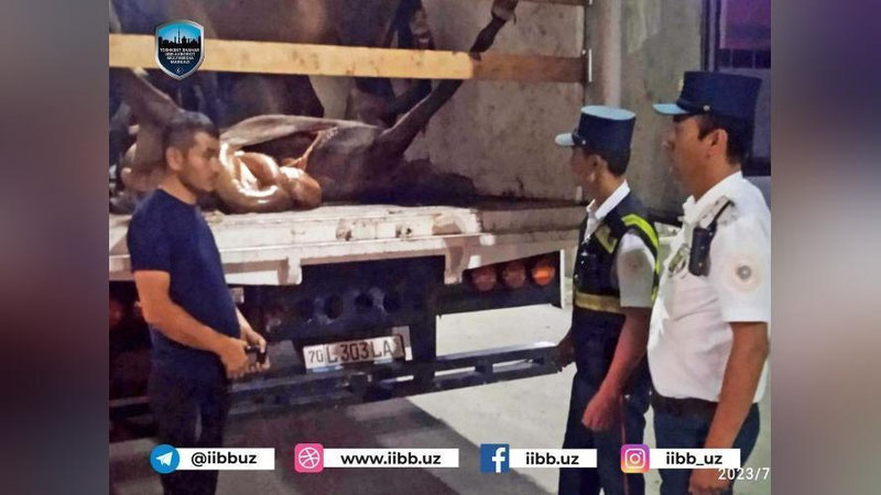 На посту ДПС “Эркин” было остановлено транспортное средство марки “Исузу”, следовавшее из Кашкадарьинской области в Ташкент. В ходе проверки в грузовом отсеке автомобиля, которым управлял Сарвар Т. 1989 года рождения, было обнаружено 6 живых лошадей и мясо одной забитой лошади весом примерно 350 кг.