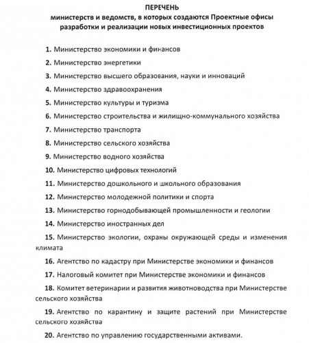 С 1 августа 2023 года в 20 министерствах и ведомствах будут созданы Проектные офисы разработки и реализации новых инвестиционных проектов: