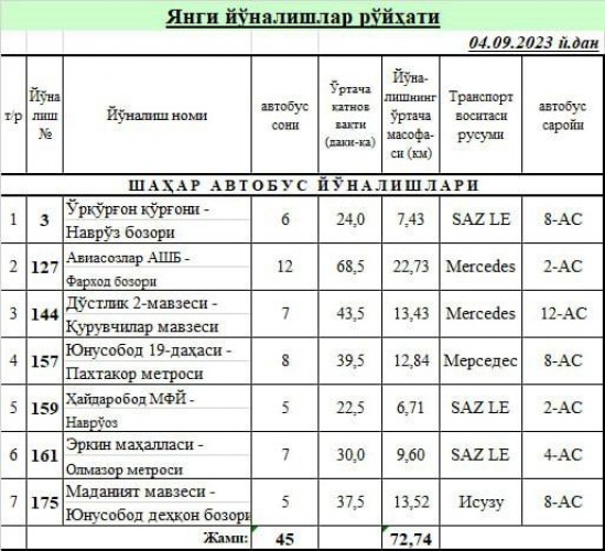 На основании поступивших заявок от пассажиров, начиная с 4 сентября в Ташкенте организуются дополнительно 7 новых автобусных маршрутов: