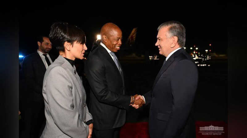 В аэропорту высокого гостя встречали мэр Нью-Йорка Эрик Адамс, председатель Американо-Узбекской торговой палаты Кэролин Лэмм и другие официальные лица.