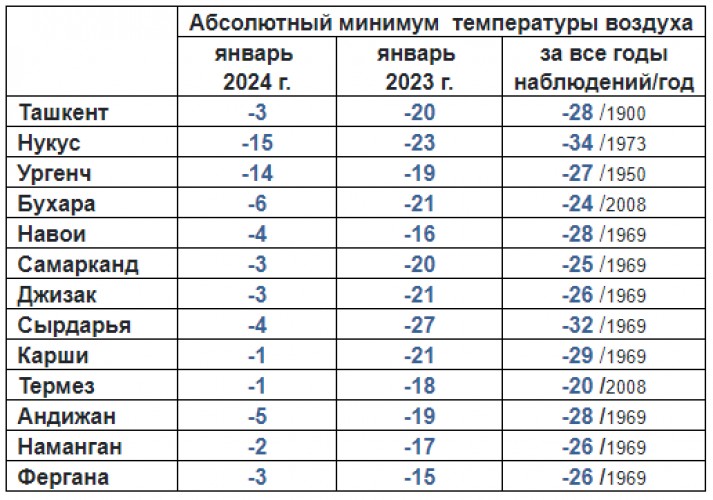 В январе 2023 года за счет вторжения холодного арктического воздуха во второй декаде месяца, температура воздуха в ночные часы понижалась до 17-22° мороза, по Республике Каракалпакстан, Ташкентской, Самаркандской Сырдарьинской, Джизакской Андижанской областей местами до 25-29° мороза.