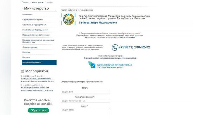 На официальном веб-сайте Министерства внешних экономических связей, инвестиций и торговли Республики Узбекистан открыта виртуальная приемная главы МВЭСиТ Элёра Ганиева.